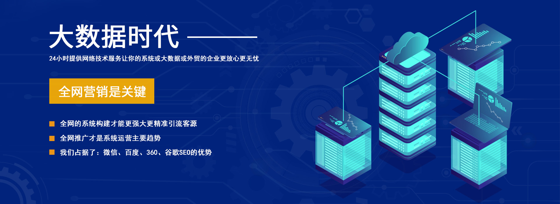 服務特色:24小時提供網絡技術支持,讓你的系統或大數據或外貿的企業更放心更無憂。